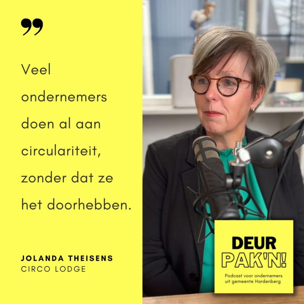 Deurpak’n is de podcast voor ondernemers uit de regio Hardenberg. Deze aflevering gaat over circulariteit en duurzaam ondernemen. Tijdens de aflevering is Jolanda Theisens van Circo Lodge te gast. Zij is bezig met het bouwen van circulaire recreatiewoningen. Hoe is zij begonnen met circulair ondernemen? En wat is circulariteit eigenlijk?